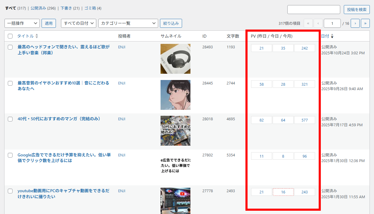 サイト全体のアクセスを眺めるだけでなく”記事ごと”のアクセス推移もチェックできアクセス減がどこに発生したのかをすぐに確認することが可能です。