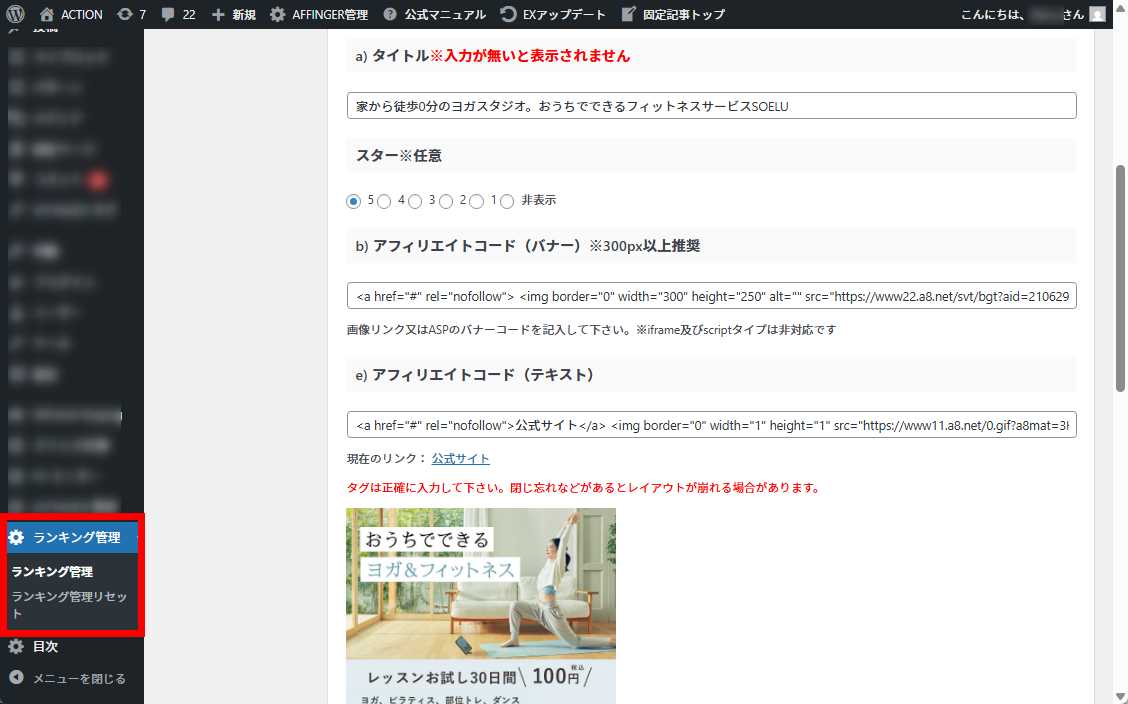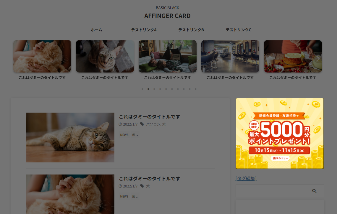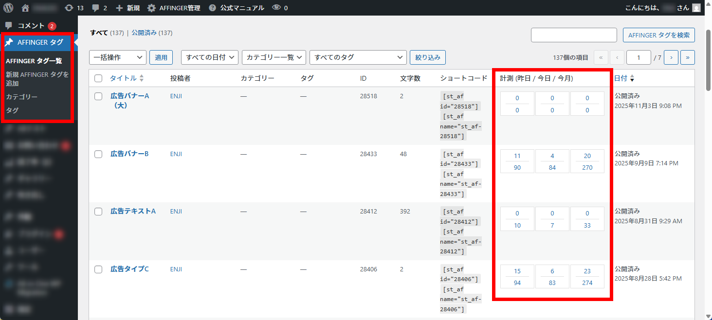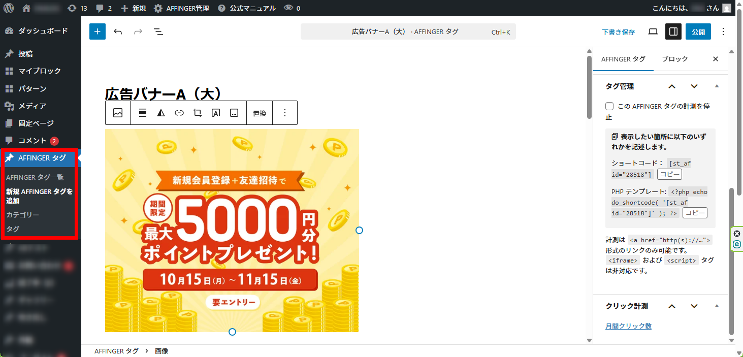 広告のコードはAFFINGERタグで登録・管理できます(広告コード以外もOK)。